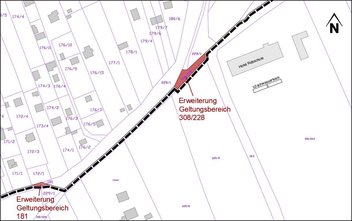 Mit dem Beschluss Nr. GR Frey-2025/758 wurde der Geltungsbereich um Teile der Flurstücke 181 und 308/228 (siehe Abb. unten) erweitert.